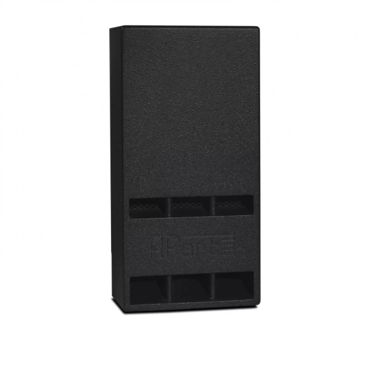 В качестве материала корпуса применяется мультиплекс (birch multiplex), представляющий собой набор, состоящий из проклеенных спрессованных пластов березового шпона, и отличающийся высокой прочностью и долговечностью. Сабвуфер получил превосходно демпфированный кабинет с акустическим оформлением типа bandpass 4-го порядка, который включает в себя две камеры, в каждой из которых находится по одному длинноходному 10-дюймовый вуферу с двойной катушкой. Задействована технология push-pull. Такая конструкция позволяет сократить размеры корпуса, а также получить хорошую выходную мощность, отличные переходные характеристики и низкие искажения. Низкочастотные драйверы в таком случае обеспечивают более четкий, быстрый и глубокий бас, чем, например, вуферы диаметром в 15 или 18 дюймов, установленные в обычные корпусы. Каждый из НЧ-динамиков выдерживает пиковую мощность в 600 Вт и стабильно работает при 400 Вт. Передняя часть кабинета имеет два щелевых порта. Нижний порт несколько большего размера расположен у основания, а верхний – на расстоянии в треть корпуса над ним. Благодаря этому модель можно устанавливать близко к стенам помещения.