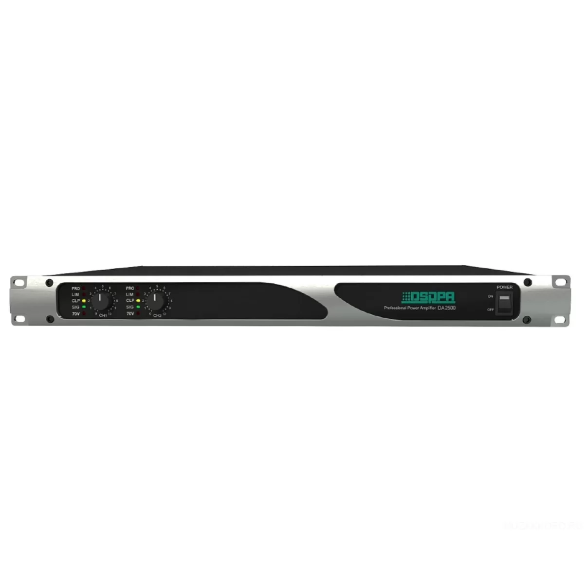 DSPPA DA-2500 - 2-х канальный трансляционный усилитель мощности. Предназначен для усиления звукового сигнала в системах музыкально речевой трансляции. Особенности: автоматическая регулировка скорости вращения вентилятора охлаждения, линейный выход/входы: балансный, Phoenix; выходы громкоговорителей: 100В/70В, · индивидуальная регулировка громкости для каждого канала; три уровня защиты.