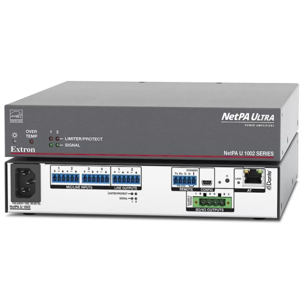Extron NetPA U 1002 – это усилитель Extron с поддержкой Dante и сертификацией ENERGY STAR на два канала с выходом 100 Вт, разработанный в корпусе «пленум» 1U в половину ширины стойки. Благодаря встроенному процессору DSP усилитель NetPA U 1002 поддерживает основные функции обработки сигналов, что позволяет отвечать требованиям сложных, децентрализованных систем, в то время как поддержка программного обеспечения Dante Domain Manager и стандарта AES67 гарантирует совместимость с широким рядом конфигураций в масштабе всей организации и другими аудиоустройствами на базе сети. Исключительные тепловые характеристики конструкции усилителя предоставляют возможность установки без дополнительного пространства для вентиляции, что позволяет сэкономить ценное место в аппаратной стойке. Дизайн NetPA U 1002 отличается высокоэффективной и усовершенствованной технологией класса D и обладает такими характеристиками, как автоматический переход в режим Standby с возможностью отмены и быстрой активацией, а также запатентованное Extron подавление пульсаций напряжения класса D (CDRS - Class D Ripple Suppression).