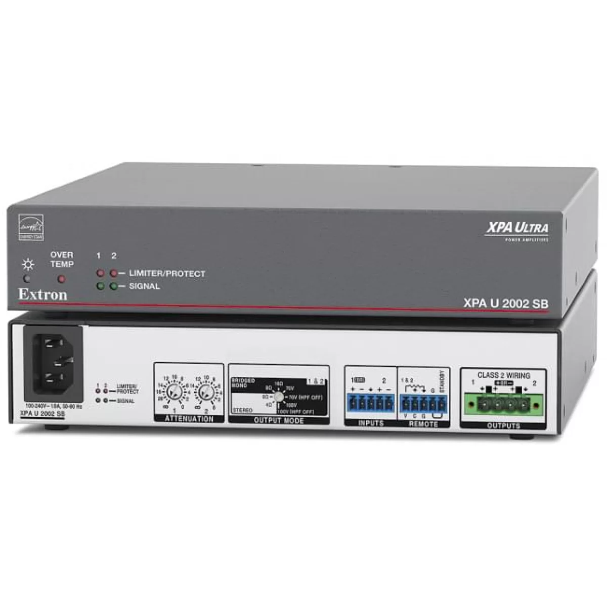 Extron XPA U 2002 SB – это двухканальный аудиоусилитель стандарта ENERGY STAR с гибким выходом, поддерживающий работу при нагрузке 8 Ом, 4 Ом, 70 или 100 В. Объединение каналов в мост позволяет обеспечить два канала 200 Вт в системах с низким импедансом или один канал 400 Вт в системах с низким или высоким импедансом. Поворотный переключатель на задней панели гарантирует быстрый и простой выбор режима выхода. А корпус XPA U 2002 SB в исполнении «пленум» с конвекционным охлаждением не требует дополнительного пространства для вентиляции и включает монтажные крепления для стойки. Этот усилитель отличается высокоэффективной и усовершенствованной технологией класса D и обладает такими характеристиками, как автоматический переход в режим Standby с возможностью отмены и быстрой активацией, а также запатентованное Extron подавление пульсаций напряжения класса D (CDRS - Class D Ripple Suppression). Модели XPA Ultra SB также поддерживают удалённое управление громкостью и отключением звука благодаря использованию контроллеров Extron VCM, VC или определённых моделей MediaLink.