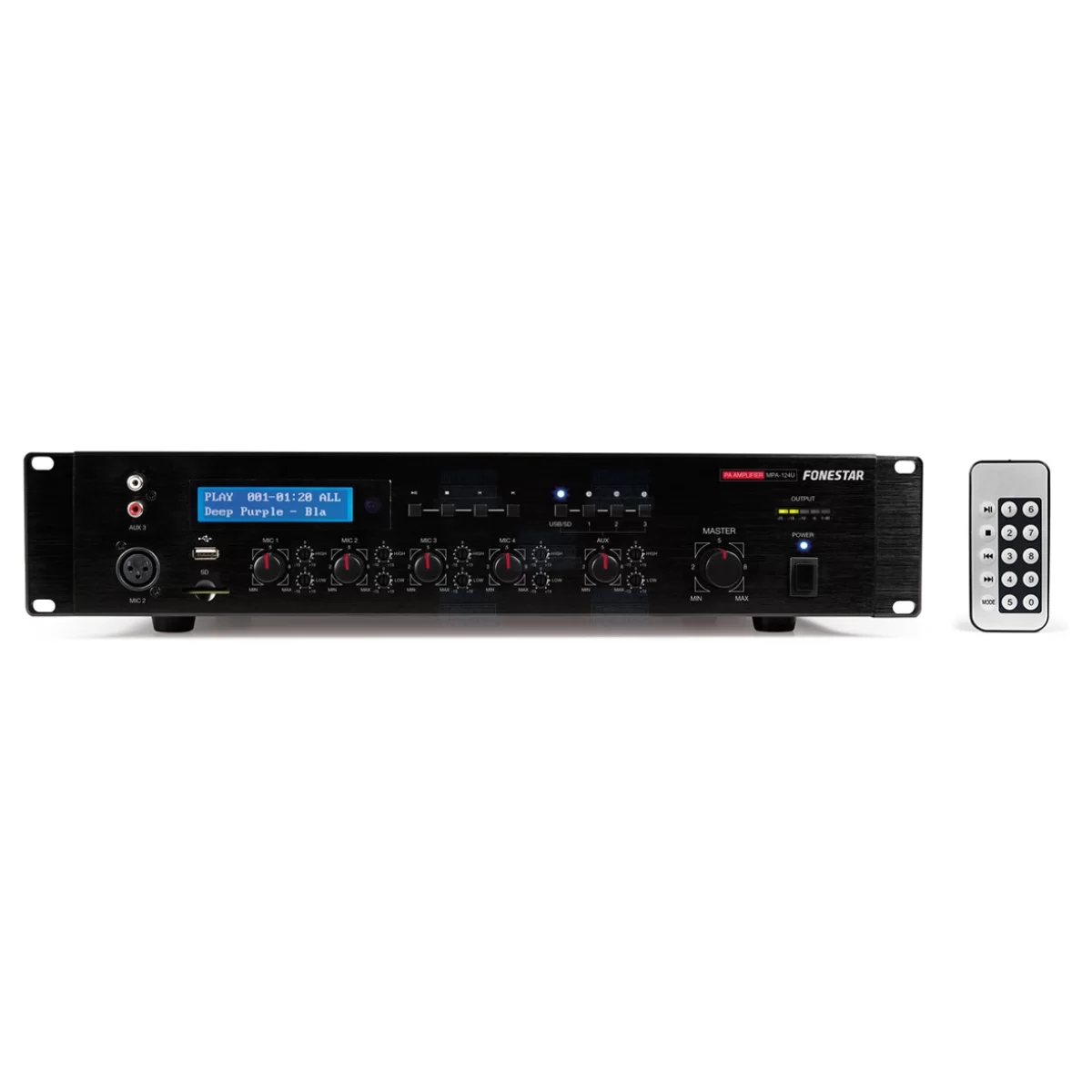 силитель мощности с медиаплеером MPA-124U - это устройство для системы озвучивания одного помещения. Обеспечивает высококачественный звук, работает со всеми современными акустическими системами FONESTAR или иных производителей, обладающих входным импедансом 4 Ом (низкоомные) или рассчитанных на рабочее напряжение 70/100В (трансляционные). Отлично подходит для реализации звукофикации в ресторанах, кафе, барах, отелях, учебных заведениях, администрациях, офисах и т.д.