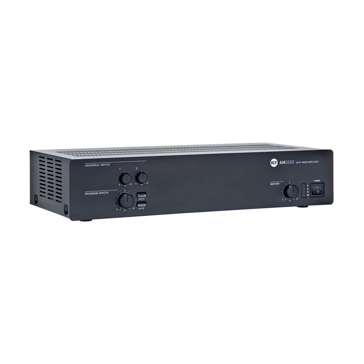 RCFRCF AM 2080 — Это микшер-усилитель с двумя входами микрофонного/линейного уровня сигнала на съемных разъемах (первый вход также имеет гнездо XLR) и двумя вспомогательными входами для музыкальных источников (например, проигрыватели компакт-дисков, тюнеры и т. д.).