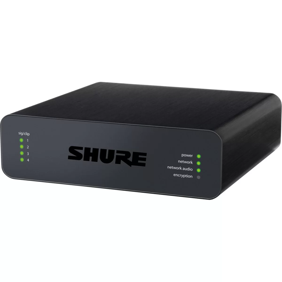 Для вывода аудиосигнала предусмотрено четыре балансных выхода на стандартных 3-контактных разъемах XLR. Задержка системы при конвертации из цифры в аналог составляет 0.71 мс без учета задержки самой сетью Dante, которая также крайне мала. Для подключения к ней предусмотрен вход на разъеме RJ45, посредством которого также осуществляется энергообеспечение устройства по технологии Power over Ethernet (PoE). Для коммутации производитель рекомендует использовать кабель Cat 5e или старше. Редакция всех доступных параметров возможна при использовании бесплатной программы Shure Web Device Discovery, которая существует для платформ Windows и macOS. В ней позволяется поворачивать фазы сигналов, изменять АЧХ с помощью 4-полосного параметрического эквалайзера, мьютировать и суммировать каналы, а также применять цифровое усиление до 140 дБ. Лицевая панель оборудована 4-сегментной индикацией уровня громкости, которая может сообщить о клиппинге, а также светодиодами, отображающими статус работу. Корпус выполнен в размере 1/3 от рэкового стандарта 1U, благодаря чему три таких прибора могут быть компактно расположены в рэковом модуле с помощью крепления CRT1, которое приобретается опционально. В комплекте поставляется одноблочное крепление Single-unit Mounting Tray, служащее для монтажа на нижней части какой-либо поверхности, например, стойки или стола.