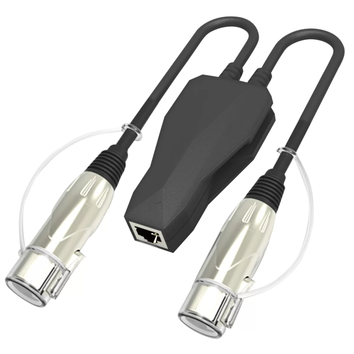 Данный адаптер имеет один вход DANTE RJ45 и два аналоговых входа XLR. Используя балансные входы XLR, можно легко подключать аналоговые устройства к сети DANTE, обеспечивая работу и масштабируемость, которые возможны только в такой сети. Микшерный пульт, микрофон и другие источники аналогового сигнала могут быть подключены к сети DANTE через разъём XLR.