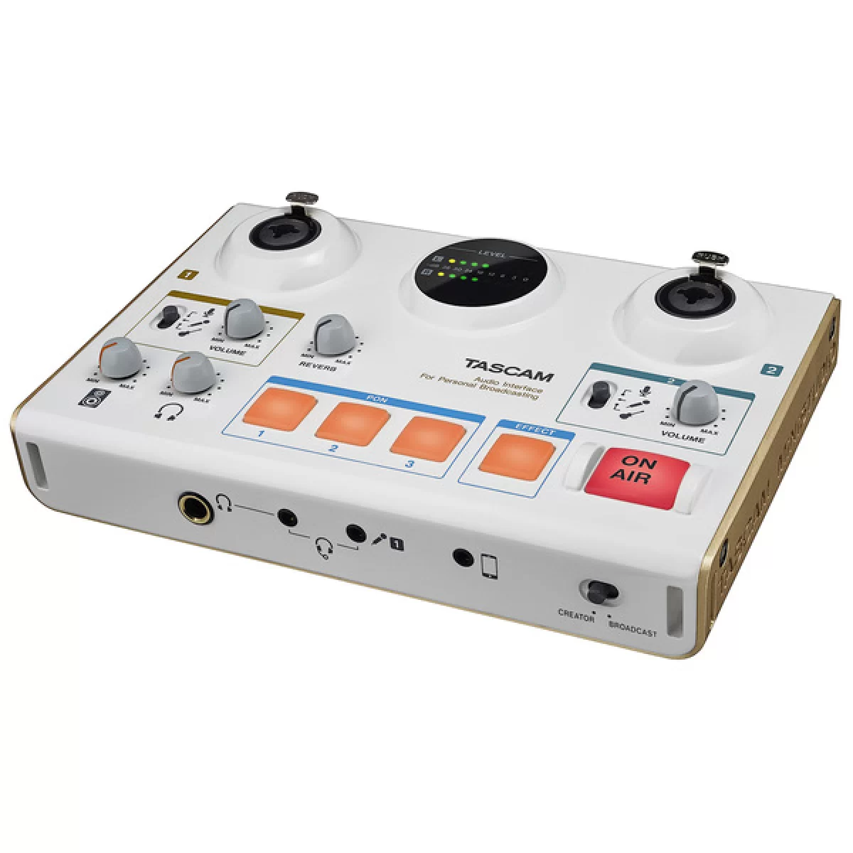 На корпусе TASCAM US-42 располагаются три переназначаемых кнопки звуковых эффектов. Можно использовать назначенные по умолчанию эффекты колокола, зуммера или аплодисментов, либо заменить их своим собственным файлом формата WAV или MP3. Поскольку кнопки чувствительны к скорости нажатия, с их помощью можно воспроизвести одиночный эффект или продолжительный, что возможно при удерживании кнопки. Кроме того, можно производить манипуляции и с голосом: повышайте его тон для «голоса из мультика», добавьте космическое эхо или эффект старой рации.