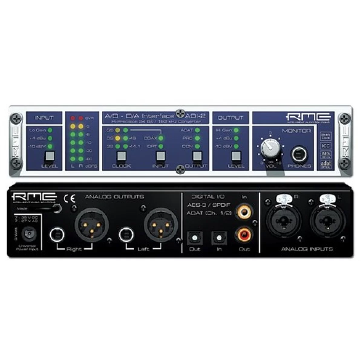 RMERME ADI-2 — 2-канальный ЦАП-АЦП конвертер, работает со стандартами передачи цифрового сигнала S/PDIF, AES и ADAT при частоте дискретизации до 192 кГц, отношение сигнал/шум составляет 100 дБ.