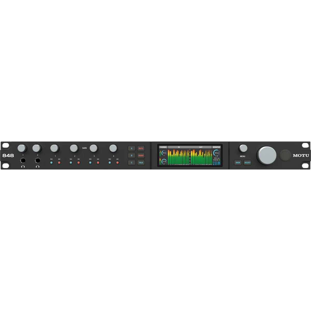 MOTU 848 — полноразмерный 1U аудиоинтерфейс для macOS, Windows и iOS с подключением по Thunderbolt 4/USB4/USB3/USB2, 28 входами и 32 выходами, встроенным DSP-микшером и сетевой AVB-аудиосистемой (до 128 каналов по сети).