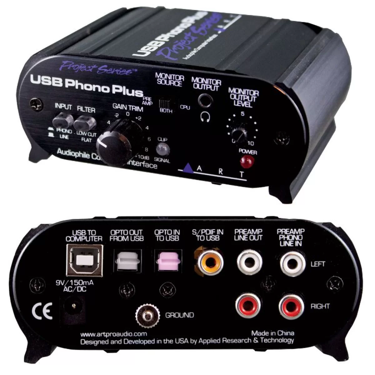 Выходные линейные разъемы (RCA) также соединены с входным преампом для контроля. ART USB PhonoPlus Project Series размещен в корпусе из анодированного алюминия. Питание устройства может осуществляться от внешнего источника, либо через USB порт. Интерфейс полностью совместим со спецификацией USB 2.0 и может работать с ОС Windows 98SE/ME/2000/XP/Vista/7, USB драйверами аудиоустройств, а также компьютеров Apple OS9.1/OS-X с встроенной поддержкой USB.