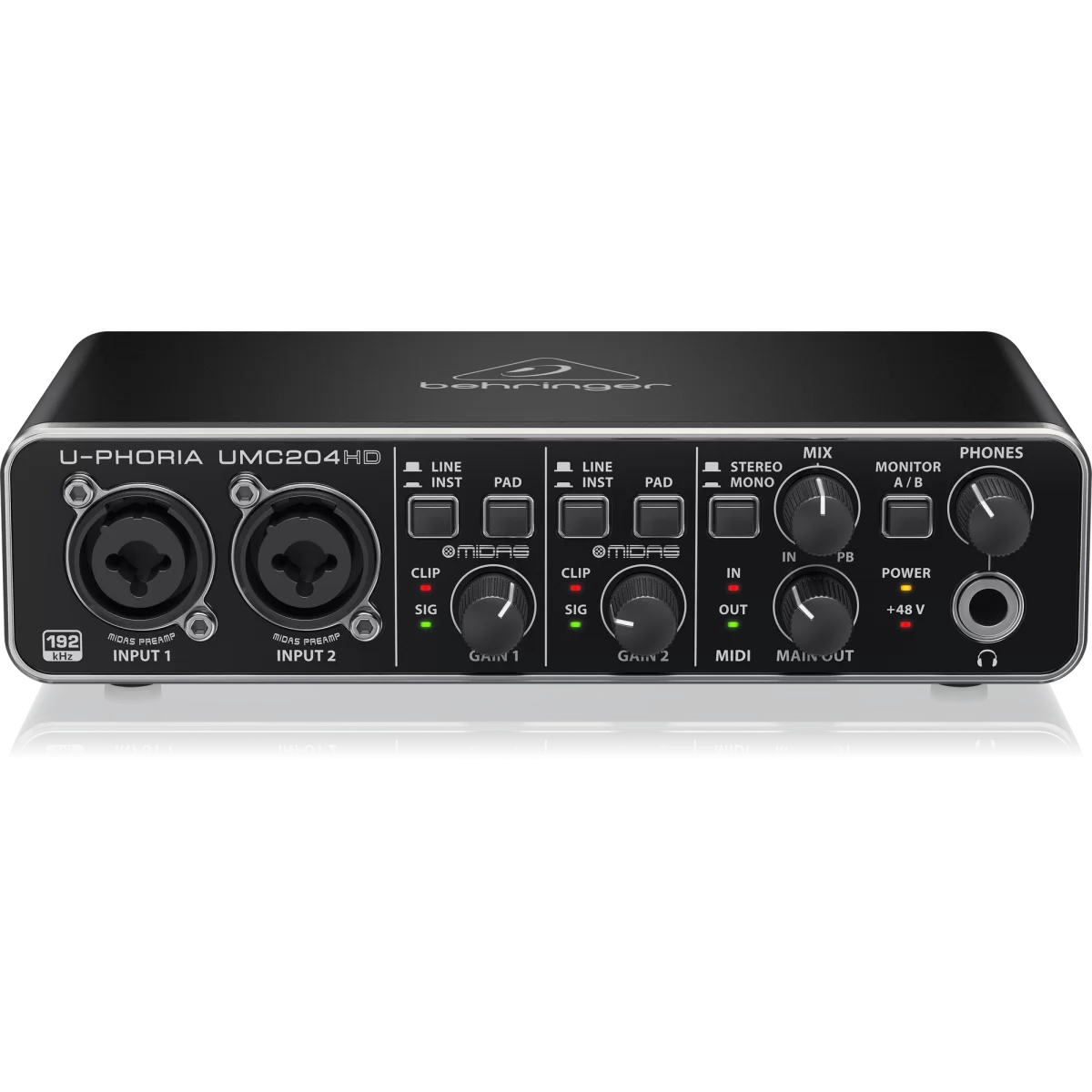 Behringer U-PHORIA UMC204HD – Это профессиональный USB-аудиоинтерфейс двумя входами и четырьмя выходами, а также с высококачественными компонентами и АЦП/ЦАП 24 бит/192 кГц.