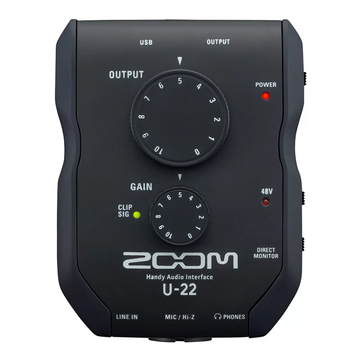 Zoom U-22 оборудован высококачественным микрофонным предусилителем, созданным на базе тех, которые были разработаны для портативных рекордеров Zoom серии H. Для единственного комбинированного входа есть возможность включения фантомного питания +48 В. Второй вход – линейный на 1/8” TRS mini-Jack (3,5 мм) – предназначен для подключения бытовых источников звука. У аудиоинтерфейса есть два выхода на разъемах RCA, что позволит легко подключать его к пульту диджея или бытовому оборудованию.